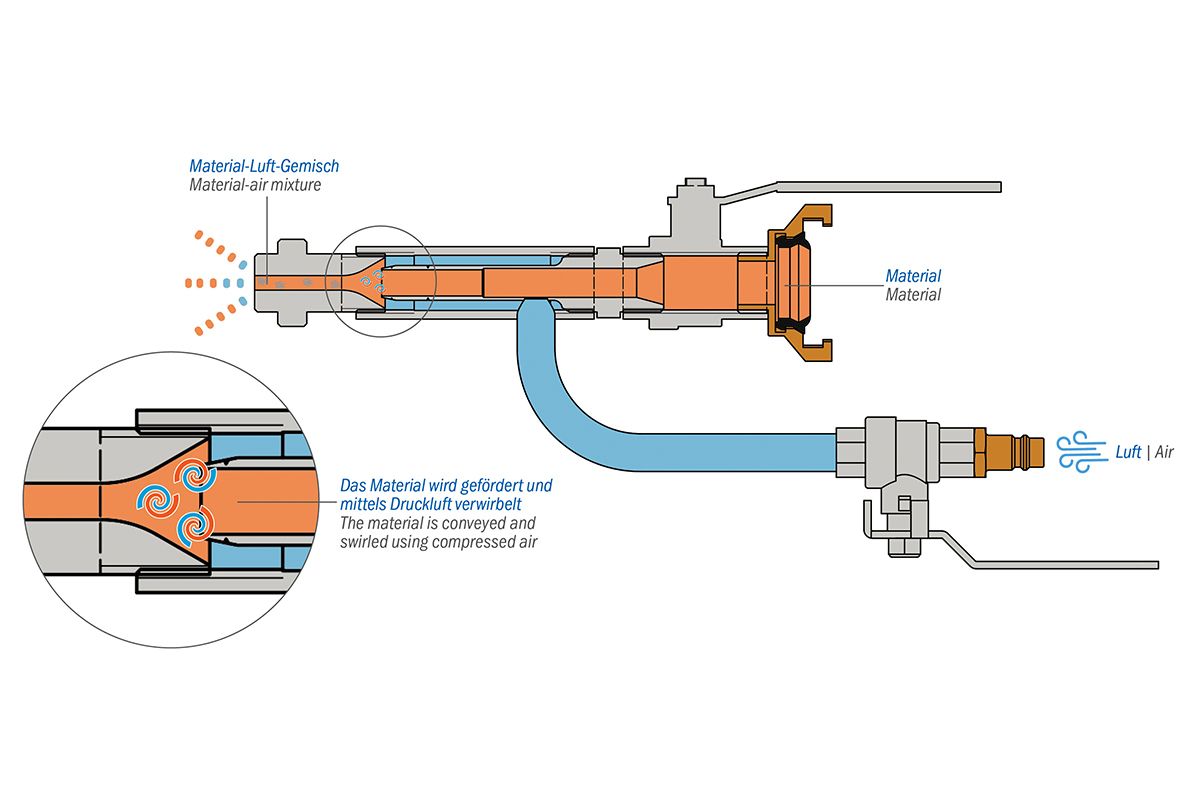 The Vario spray nozzle head sprays the material with compressed air. By turning the nozzle, the spray pattern can be adjusted to the material used. This means, no negative pressure is created which may empty the material hose. Thus, a clean spray pattern without air intakes is produced up to a layer thickness of 3 mm wet. By default, a 6 mm nozzle is used.